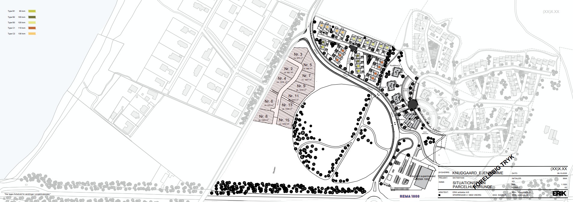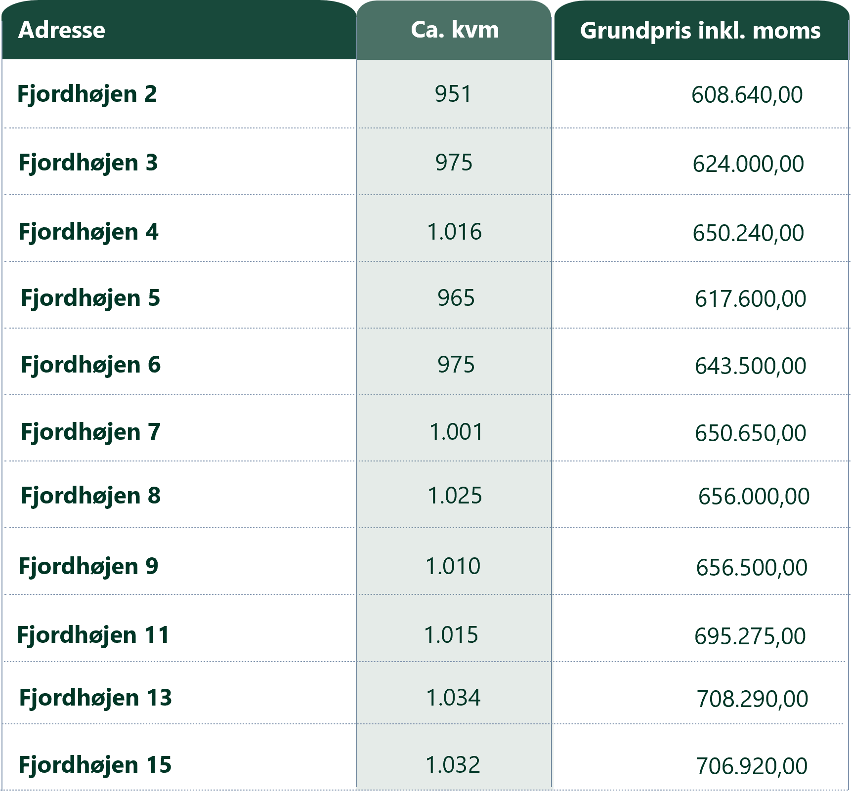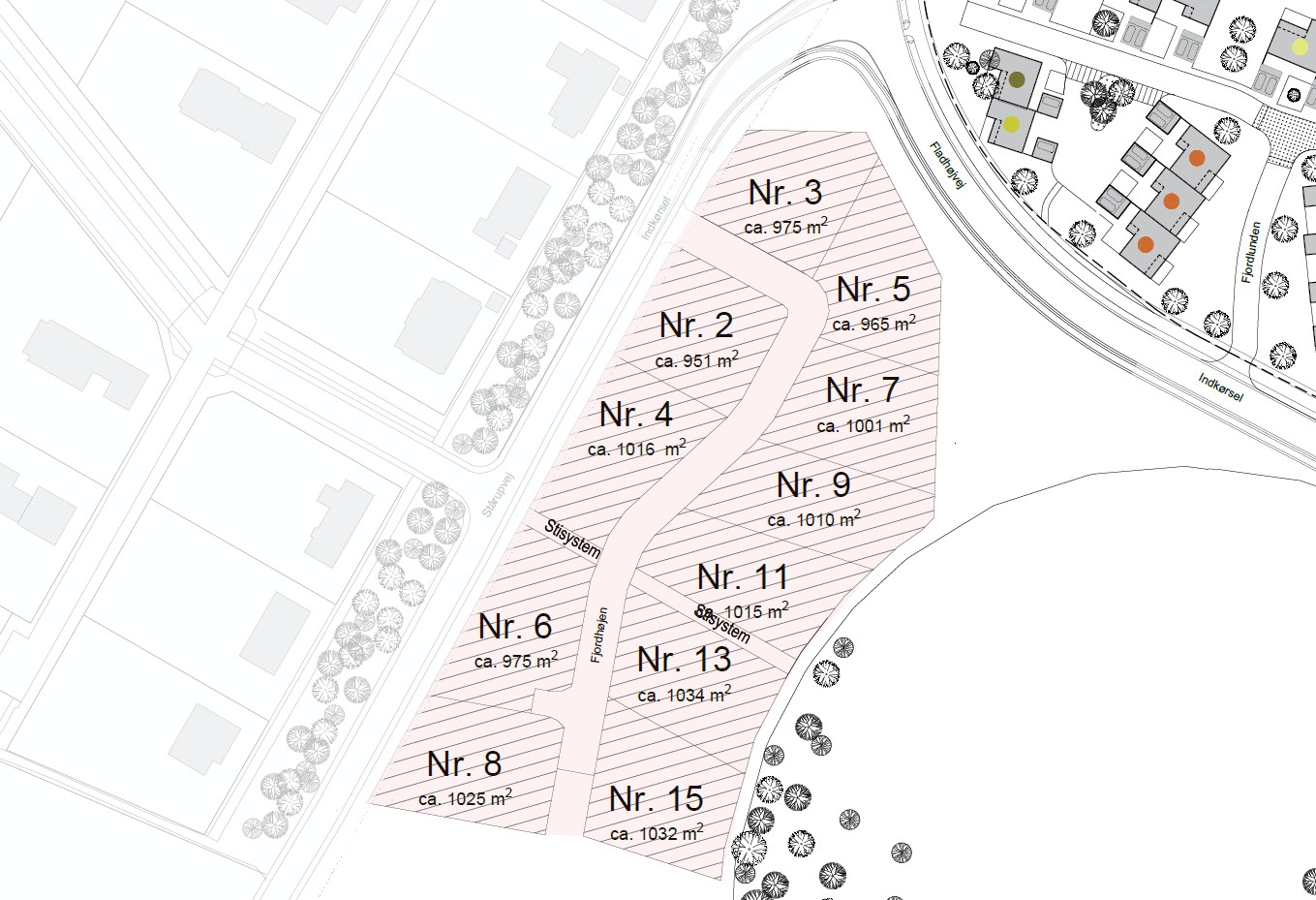 Nedenfor kan du se placeringer, grundstørrelser og priser excl. tilslutningsafgifter.